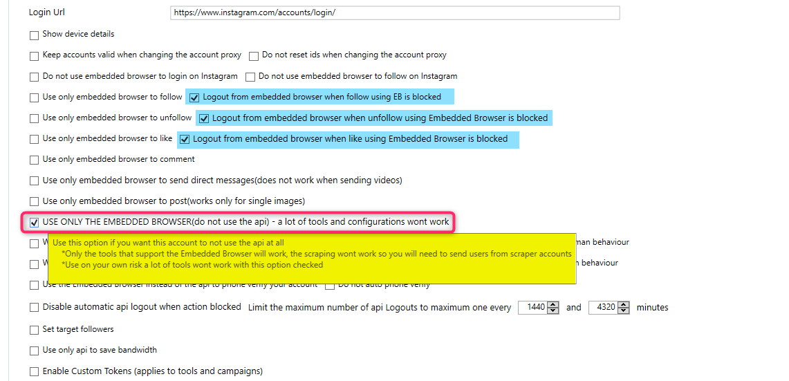 You can check them to set Jarvee to logout from the Embedded browser when those actions get blocked on the Embedded browser. That is useful because in some cases when you logout from the account and then log in, the block gets lifted.