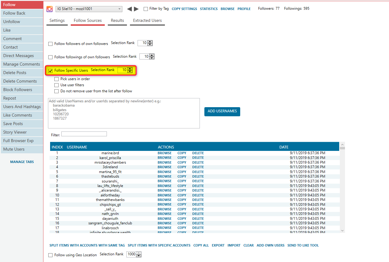 What will happen is that Jarvee will send the users that the “Instagram Account 7” extracted to the Follow, Like and Story Viewer specific users source of each of the 3 tools we mentioned above.